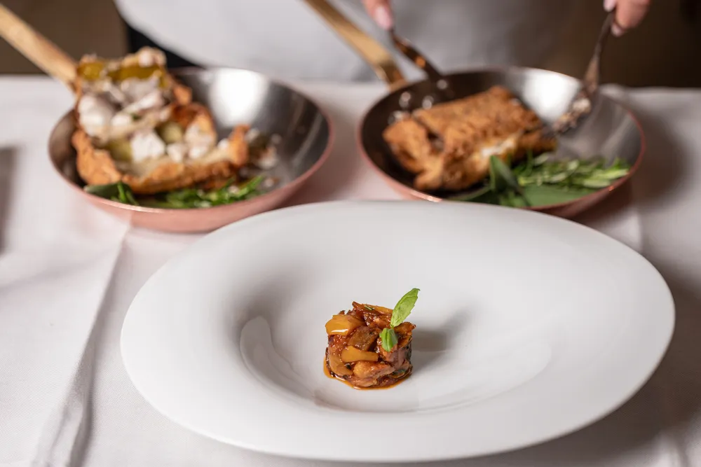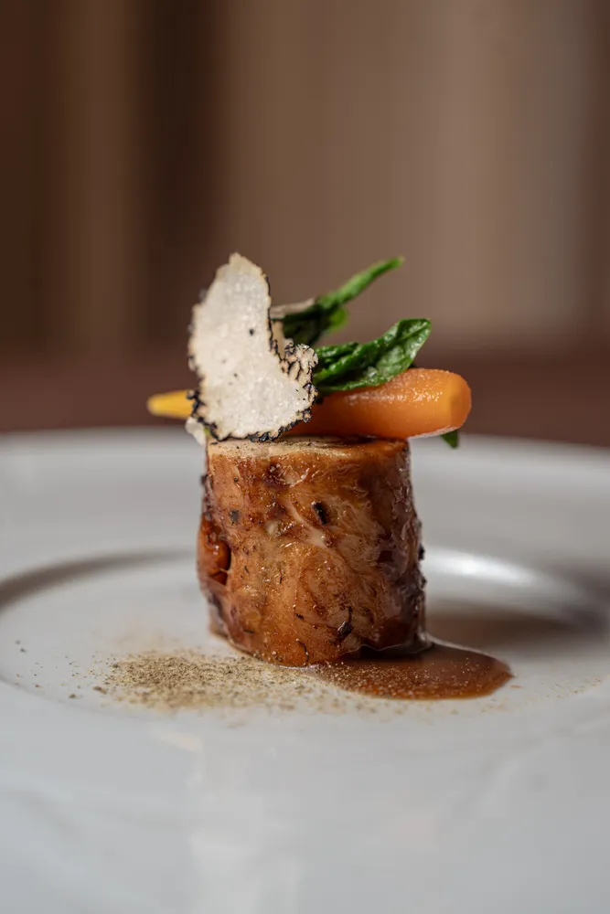 Carne di manzo Fassona finemente tritata, arricchita da scaglie di tartufo nero e una salsa delicata al limone.
