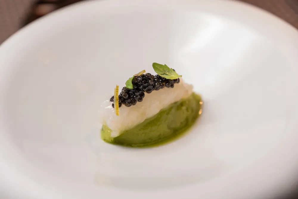 Ostrica fresca servita con caviale pregiato e una leggera granita di rapanello per un'esperienza di freschezza.