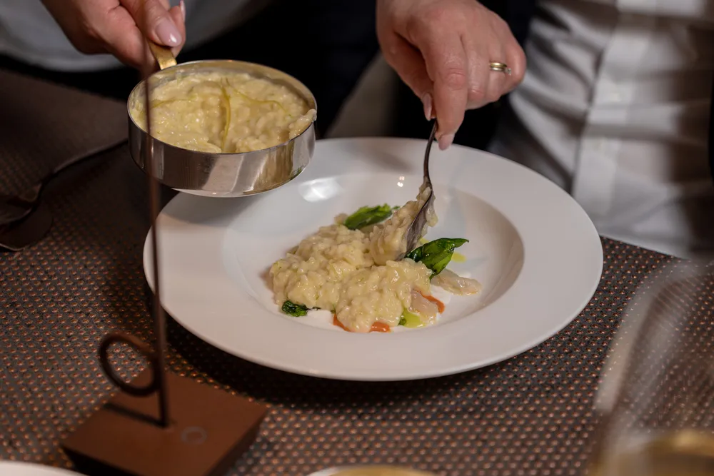 Riso Carnaroli mantecato con burro e parmigiano, arricchito da fette di tartufo bianco d'Alba grattugiato al momento.
